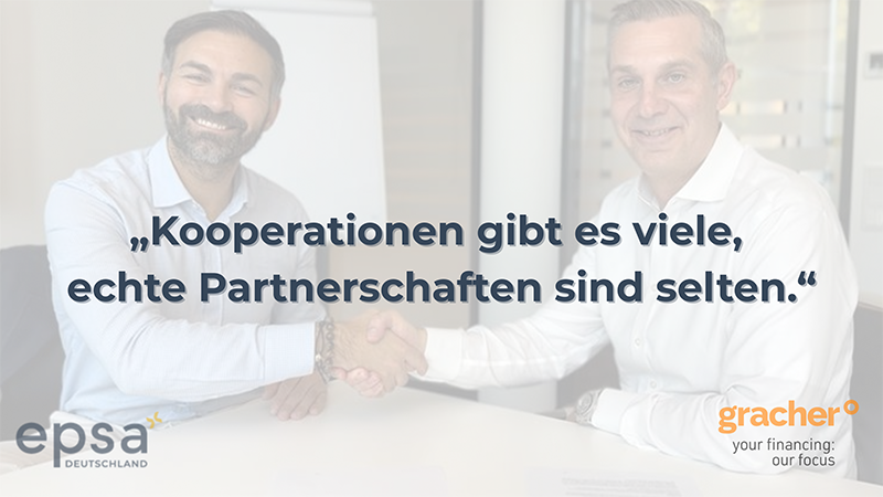 Bei gracher wird Christian Böhmer, Regionalleiter Kaution West, die Kooperation mit EPSA verantworten: „Mit EPSA gewinnen wir den stärksten Partner der Fördermittelwelt. Gemeinsam können wir unseren Kunden nicht nur Zugang zu den besten Fördermöglichkeiten bieten, sondern auch alle relevanten Finanzierungsbausteine aus einer Hand. Das ist eine echte Win-Win-Kooperation für alle Beteiligten.“